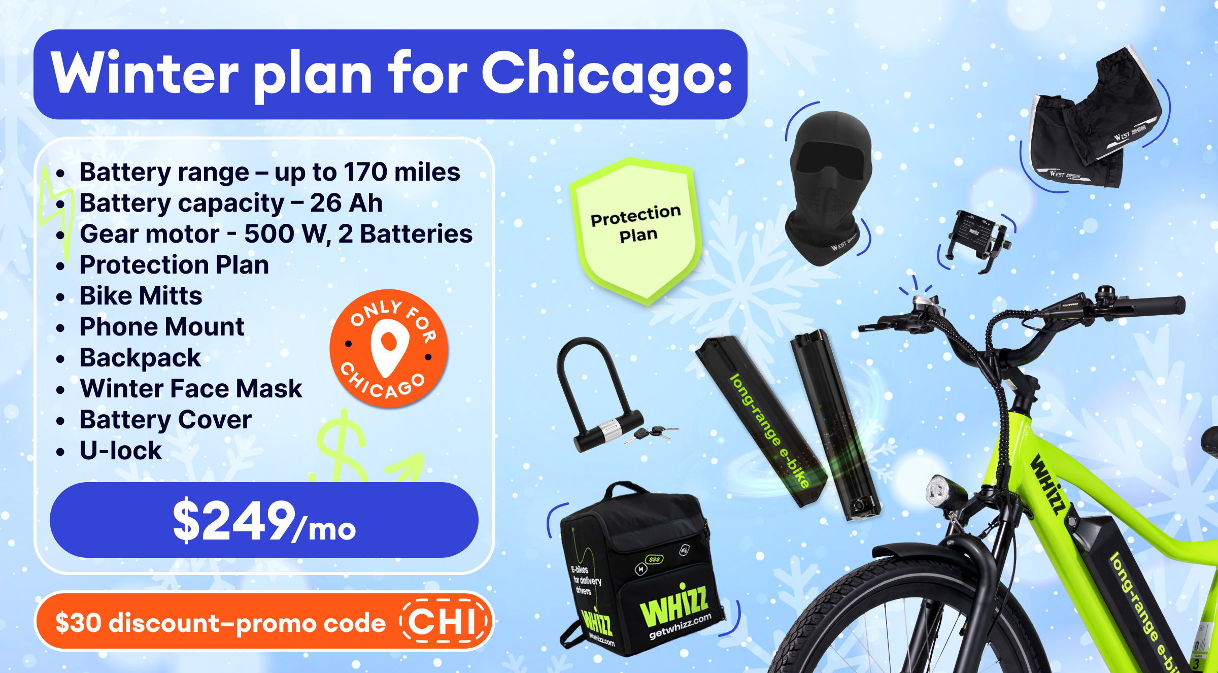 Up to 170 miles with 2 batteries. Full winter gear included.